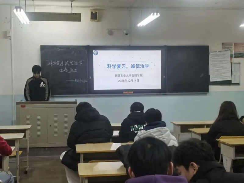 为帮助学生高效备战期末、缓解备考焦虑,新疆农业大学数理学院于2025年12月14日组织各班级开展“科学备考减压,诚信应考护航”系列主题班会,详细讲述了科学复习和情绪调节的方法与具体作用,为学生们的学业成长保驾护航。