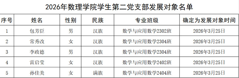 为严格遵循发展党员工作程序,严把党员入口关,确保新党员发展质量,经个人申请、培养联系人推荐、党支部委员会审查,并经支部党员大会讨论通过,现将2026年度上半年5名发展对象推选结果名单公示如下。