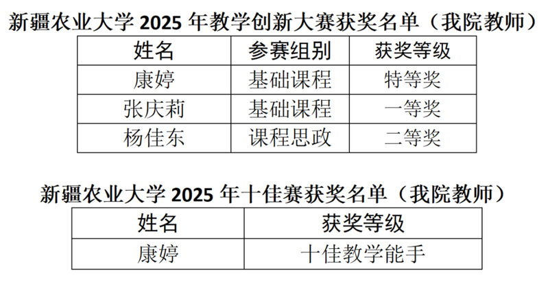 近日,在新疆农业大学2025年教学创新大赛暨“十佳教学能手”竞赛中,我院教师喜创佳绩,取得历史性突破!